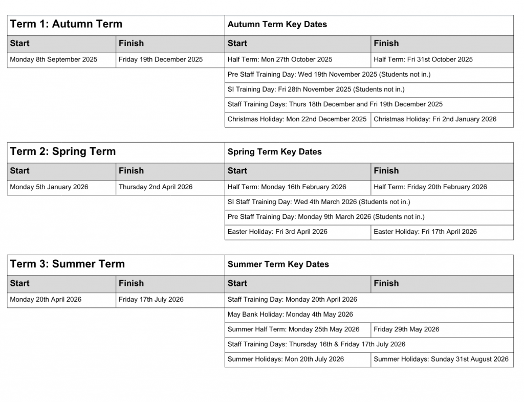 Any changes to our published dates will be communicated ahead of time so that everyone can plan accordingly. Please do check back for exam booster session dates etc. which are advertised later in the academic year.